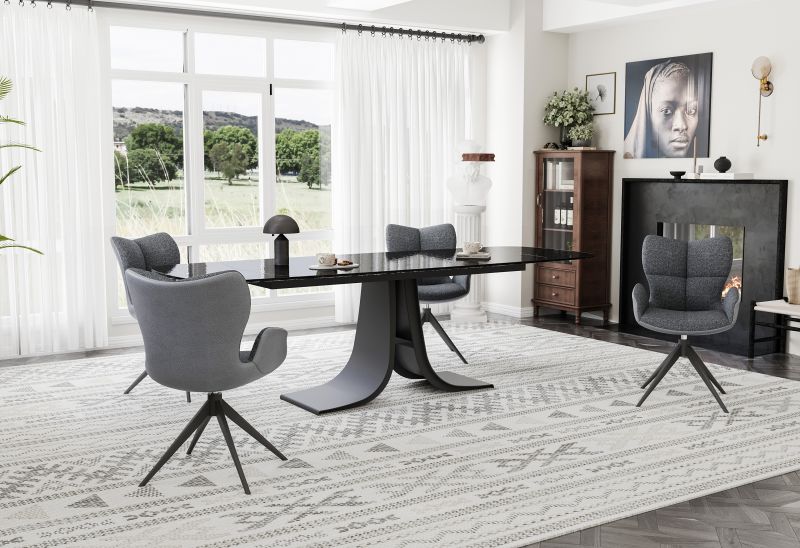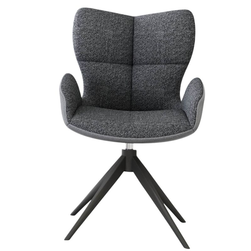 Moderna blagovaonska stolica, dizajnirana za udobnost i funkcionalnost te potpuno presvučena visokokvalitetnom tkaninom u sivoj boji.
