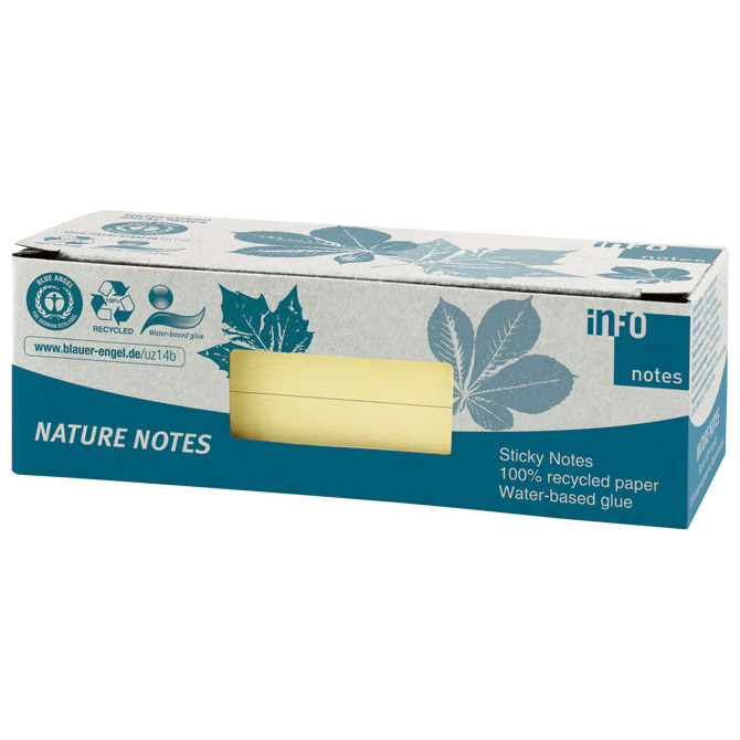 Specifikacija: dimenzija: 40×50 mm; 12×100 listova; mogućnost višestrukog premještanja; izrađen od 100 % recikliranog papira; ekološki prihvatljiv (Blue Angel certifikat); ljepilo je bez otapala izrađeno na bazi vode; u 100 % recikliranoj kartonskoj kutiji
