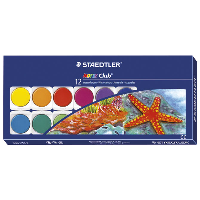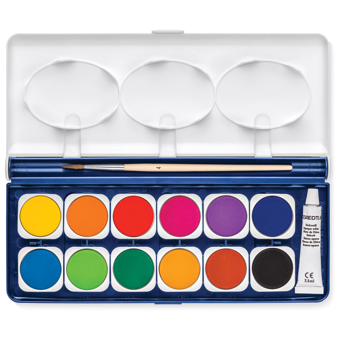 Specifikacija: fi 30 mm; s bijelom temperom i kistom; 12 boja; poklopac je paleta; PVC kutija; svaka boja u zasebnoj PVC kutijici; sukladno normi EN 71
