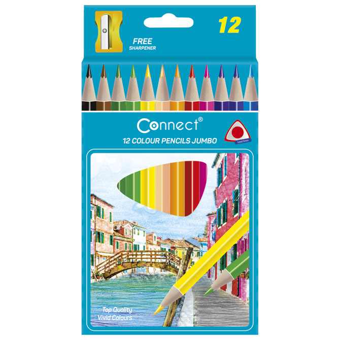 Specifikacija: šiljene; debljina mine: 4 mm (debela mina); trokutaste; set od 12 boja i šiljilo; otporne na lom; kartonska kutija; blister