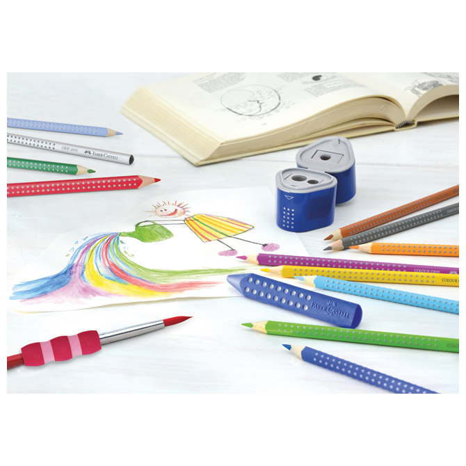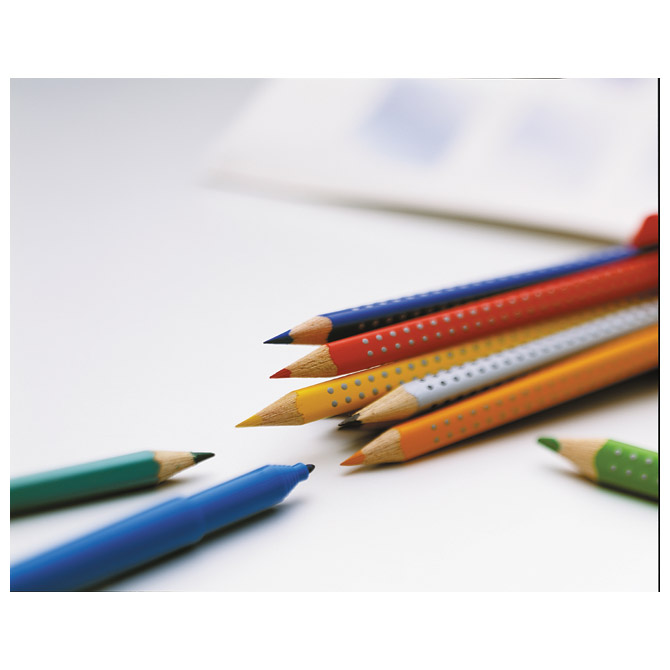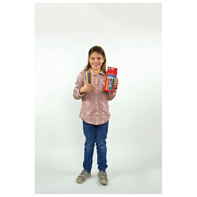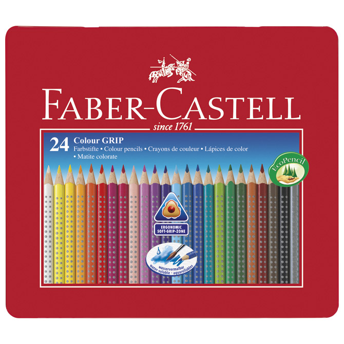Specifikacija: šiljene; debljina mine: 3,3 mm; trokutaste; ergonomske; kad se sa mokrim kistom prijeđe preko crteža dobije se akvarel (crtež nacrtan sa vodenom bojom); s patentiranim gripom za sigurno, ne klizno držanje; živopisne boje; jako mekan vrh za veću pokrivenost površine papira bojanjem; posebno je otporna na lomljenje (specijalno spajana – SV); ispiru se sa većine tkanina; visoke performanse; eko olovka (drvo iz certificiranog održivog šumarstva); tijelo lakirano eko lakom na bazi vode; pogodna za ljevake i dešnjake; mjesto za upisivanje imena na svakoj bojici; metalna kutija
