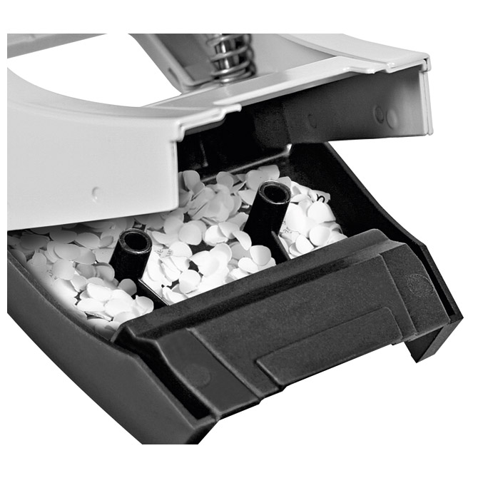 Specifikacija: 2 rupe; buši do 30 listova ili debljina 3 mm; razmak između rupa je 80 mm; sa spremnikom za otpadni papir u boji bušača; ima plastični graničnik za formate: A4, A5, A6,…; garancija 10 godina