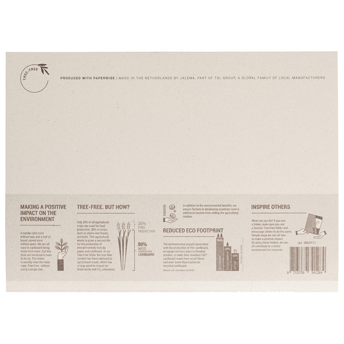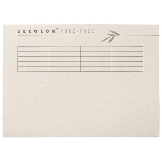 Specifikacija: format: A4; dimenzija: 225×310 mm; karton; prednja strana je s otisnutim linijama za lakše i preglednije označavanje sadržaja; izrađen od poljoprivrednog otpada odnosno od listova i stabljika koji bi se inače spaljivali na otvorenom; za izradu ovog artikla se ne koristi niti jedno stablo!