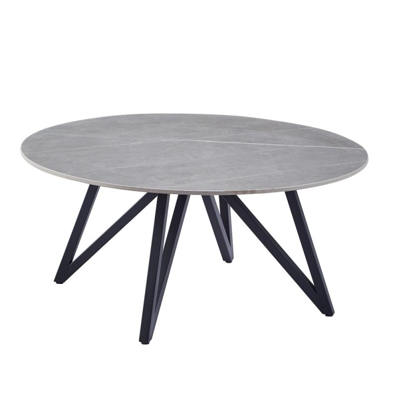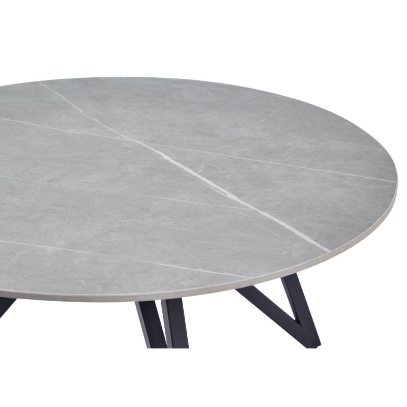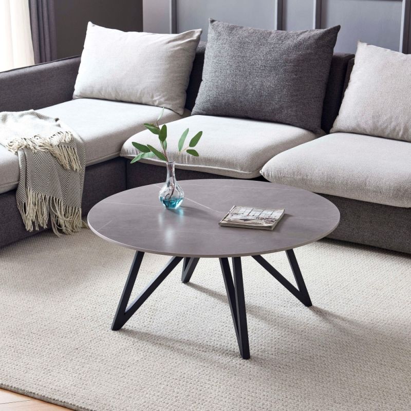 Niskoprofilni stolić za kavu okruglog oblika. Ploča stola izrađena je od sinteriranog kamena s prekrasnim mramornim uzorkom u mat sivoj boji.
