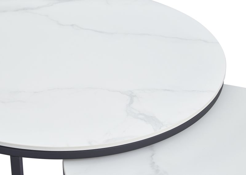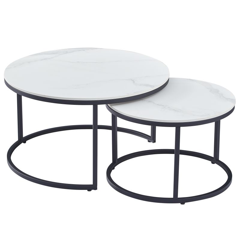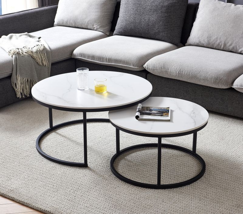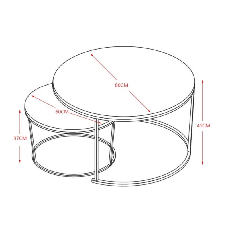 Set se sastoji od dva stola različitih veličina. Veći stol je visok 41 cm i ima prostrani promjer od 80 cm, pružajući dovoljno prostora za ukrasne predmete, pića ili svakodnevne predmete.