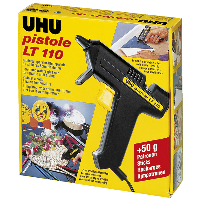 Specifikacija: težina: 180 g; količina otapanja/sat: 280 g; za: dekoraciju, kreativno oblikovanje i kućne popravke; lijepljenje pri nižoj temperaturi omogućava veću sigurnost i veću univerzalnu primjenu; za: drvo, metal, umjetne materijale, staklo, keramiku, kožu, tekstil, Styropor® i druge materijale koji su osjetljivi na visoke temperature; mogu se koristiti ulošci sa šljokicama i u boji; snaga 10 W; vrijeme zagrijavanja 3-5 minuta; sadrži 4 patrone; 2 godine garancije kada se koriste ulošci UHU LT 110; blister