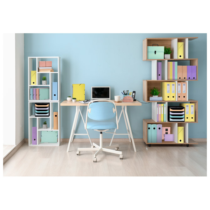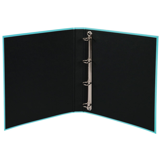 Specifikacija: format: A4; dimenzija: 300×315 mm; ring fi: 25 mm; hrbat: 40 mm; sjajni laminirani karton s vanjske strane, crni papir s unutarnje strane; debljina: 1,7 mm; kapacitet: 230 listova; 5 pastelnih boja: ljubičasta, koraljna, plava, zelena i žuta