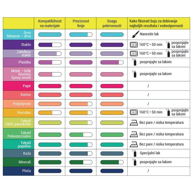 Specifikacija: pigmentna tinta na vodenoj bazi; za pisanje i dekoriranje na svjetlom i tamnom papiru i primjena na gotovo svim površinama (plastika, metal, tkanina, staklo…); idealno za kreativne aktivnosti; brzo se suši; visoka otpornost i neprozirnost tinte; velika otpornost vrha; aktiviranje vrha na markeru: protresite 20-ak puta prije upotrebe bez skidanja kapice..aktivirajte vrh tako da ga pritisnete na komad papira dok ne krene puštati tintu; po završetku vratite kapicu a vrh markera okrenite prema gore kad nije u uporabi