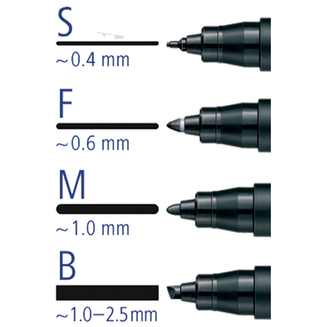 Specifikacija: permanentni; 4 širine ispisa: 0,4 mm, 0,6 mm, 1 mm i 1 & 2,5 mm; spremnik i poklopac PP; vodootporan; otporan na UV svjetlost; brzo se suši (pa je pogodan za ljevake); ne razmazuje se; slabog mirisa; primjenjuje se na gotovo svim površinama (papir, karton, folija, plastika, staklo, porculan, drvo, koža, kamen, CD,..); može biti nezatvoren danima bez isušivanja (dry safe); siguran rad u zrakoplovu zahvaljujući sustavu za izjednačavanje tlakova koji sprječava istjecanje tinte (airplane safe); ekološka tinta (bez ksilena i toulena); tijelo je izrađeno od 97 % reciklirane plastike