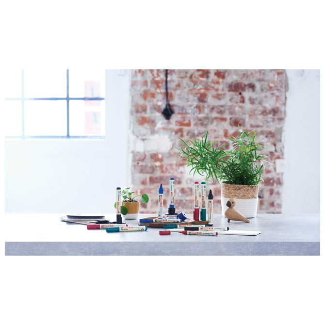 Specifikacija: s mogućnošću ponovnog punjenja; okrugli vrh; širina ispisa 1,5-3 mm; brzosušeći; vodootporan; slabog mirisa; nakon sušenja otporan na vodu i brisanje; za pisanje, isticanje i označavanje na svim materijalima (staklo, metal, plastika,…); od reciklirane plastike (90 % materijala napravljeno je od reciklirane plastike izuzev tinte); puni se Edding tušem T 25, T 100 i T 1000