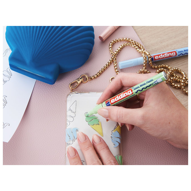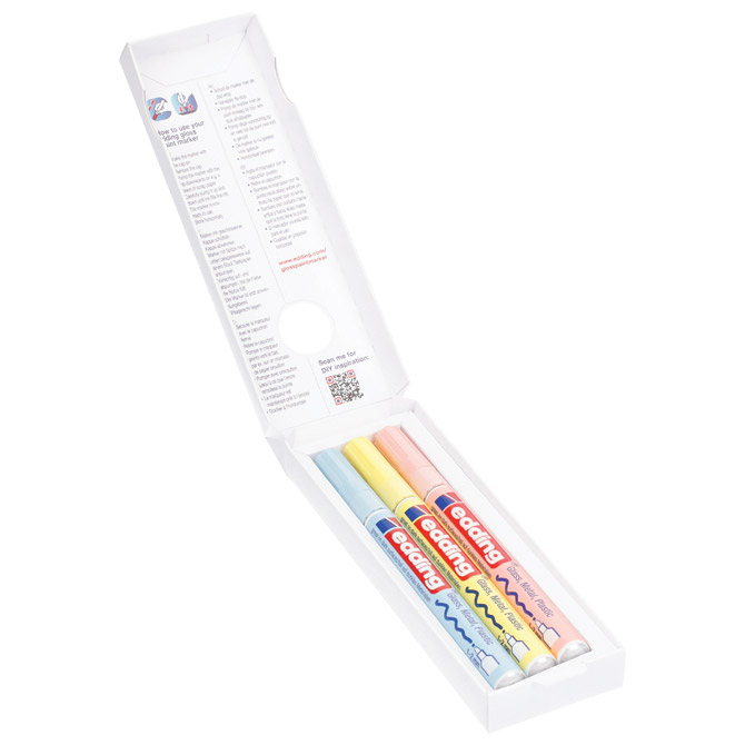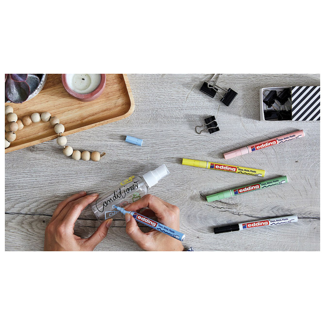 Specifikacija: permanentni; lakirajući; sjajni; okrugli vrh; aluminijsko kućište; širina ispisa 1-2 mm; visoka neprozirnost; ne ostavlja mrlje; za pisanje i dekoriranje na glatkim, tamnim i prozirnim materijalima (npr: staklu, metalu, plastici, papiru s premazom…); brzo se suši; dobro podnosi atmosferske utjecaje; otporan na trošenje (habanje); tinta nema intenzivan miris; blister