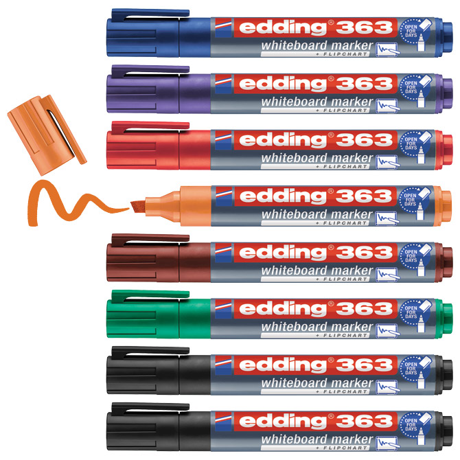 Specifikacija: nepermanentni, pigmentni s mogućnošću ponovnog punjenja; klinasti vrh; širina ispisa 1-5 mm; otporan na svjetlo; brzo se suši; lako se briše sa svih glatkih površina (staklo, melamin,…); za pisanje po svim glatkim površinama i bijeloj ploči; marker može biti bez poklopca par dana, a da se ne osuši