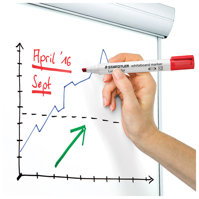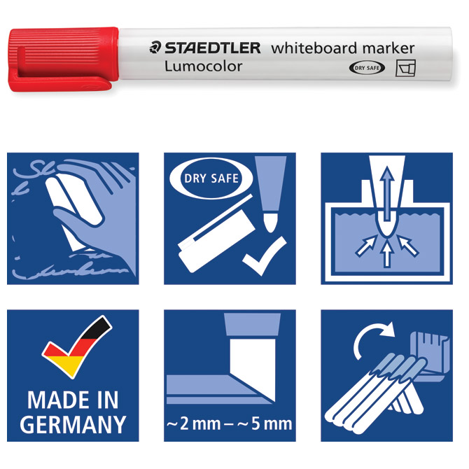 Specifikacija: nepermanentni; klinasti vrh; širina ispisa 2-5 mm; spremnik i poklopac PP; tinta topiva u vodi; brzo se suši; slabog mirisa; može se očistiti suhim postupkom s bijelih ploča i glatkih površina poput stakla i porculana bez tragova; može biti nezatvoren danima bez isušivanja (dry safe); siguran rad u zrakoplovu zahvaljujući sustavu za izjednačavanje tlakova koji sprječava istjecanje tinte (airplane safe); ekološka tinta (bez ksilena i toulena); tijelo je izrađeno od 97 % reciklirane plastike