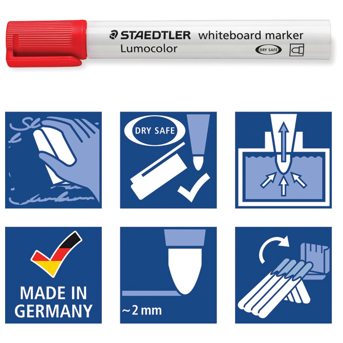 Specifikacija: nepermanentni; okrugli vrh; širina ispisa 2 mm; spremnik i poklopac PP; tinta topiva u vodi; brzo se suši; slabog mirisa; može se očistiti suhim postupkom s bijelih ploča i glatkih površina poput stakla i porculana bez tragova; može biti nezatvoren danima bez isušivanja (dry safe); siguran rad u zrakoplovu zahvaljujući sustavu za izjednačavanje tlakova koji sprječava istjecanje tinte (airplane safe); ekološka tinta (bez ksilena i toulena); tijelo je izrađeno od 97 % reciklirane plastike