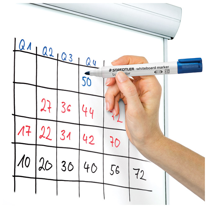 Specifikacija: nepermanentni; okrugli vrh; širina ispisa 2 mm; spremnik i poklopac PP; tinta topiva u vodi; brzo se suši; slabog mirisa; može se očistiti suhim postupkom s bijelih ploča i glatkih površina poput stakla i porculana bez tragova; može biti nezatvoren danima bez isušivanja (dry safe); siguran rad u zrakoplovu zahvaljujući sustavu za izjednačavanje tlakova koji sprječava istjecanje tinte (airplane safe); ekološka tinta (bez ksilena i toulena); tijelo je izrađeno od 97 % reciklirane plastike