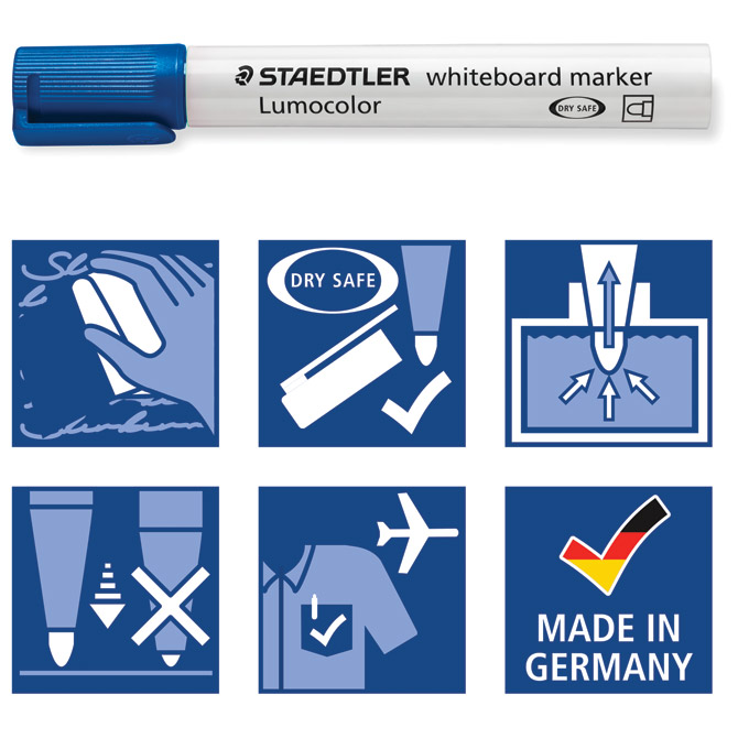 Specifikacija: nepermanentni; okrugli vrh; širina ispisa 2 mm; spremnik i poklopac PP; tinta topiva u vodi; brzo se suši; slabog mirisa; može se očistiti suhim postupkom s bijelih ploča i glatkih površina poput stakla i porculana bez tragova; može biti nezatvoren danima bez isušivanja (dry safe); siguran rad u zrakoplovu zahvaljujući sustavu za izjednačavanje tlakova koji sprječava istjecanje tinte (airplane safe); ekološka tinta (bez ksilena i toulena); tijelo je izrađeno od 97 % reciklirane plastike