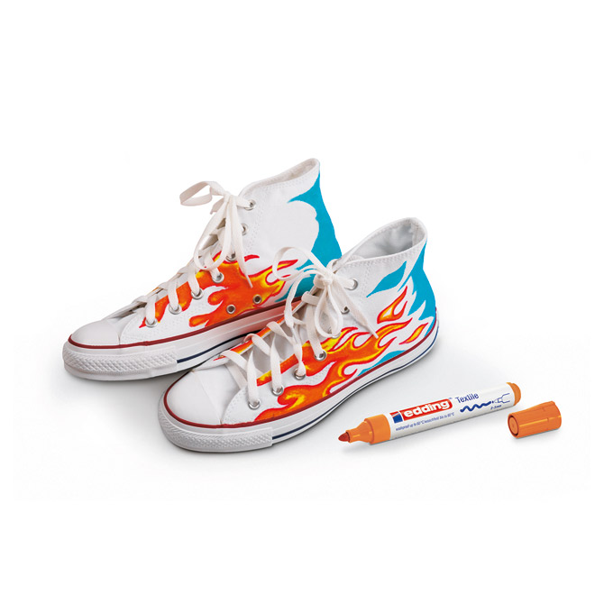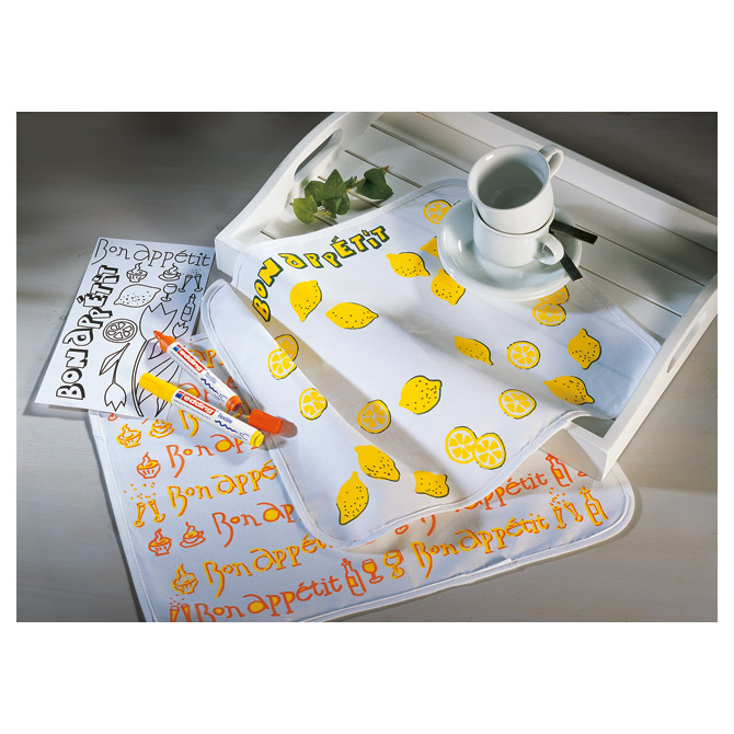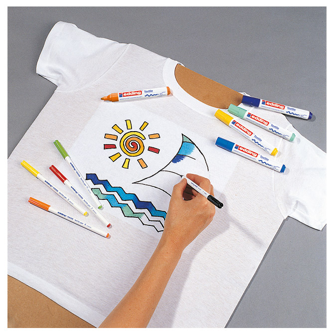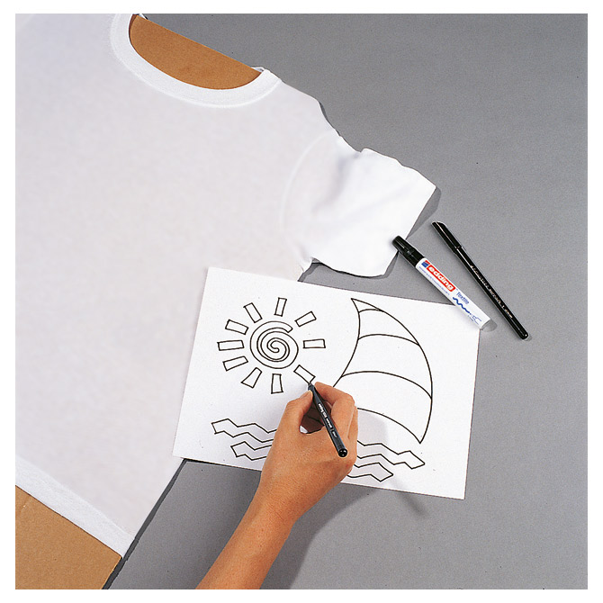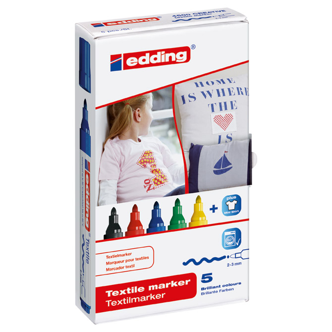 Specifikacija: permanentni, pigmentni marker za majice (pamuk, svila, lan…); okrugli vrh; širina ispisa 2-3 mm; vodootporan; otporan na svjetlo; za fiksiranje glačati bez pare; nakon fiksiranja otporan na pranje do 60° C; brzo se suši; set od 5 boja: crna, crvena, plava, zelena i žuta; blister