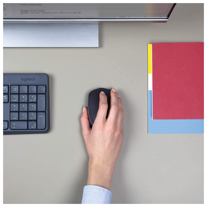 Specifikacija: bežični (domet: 10 m, 2,4 GHz); s nano prijemnikom; optički (do 1000 dpi-a); 2 tipke i kotačić (crni); jednako pogodan za ljevake i dešnjake; napajanje: baterija 1 x AA (uključena); trajanje baterije do 12 mjeseci zahvaljujući prekidaču za uključivanje/isključivanje i načinu rada za uštedu energije u automatskom stanju mirovanja (može se razlikovati ovisno o upotrebi); plastični dijelovi miša uključuju najmanje 59 % certificirane reciklirane plastike; dimenzija: 97,7×61,5×35,2 mm; težina: 70,5 g (s baterijom); OS: Windows, macOS, Chrome OS, Linux; blister