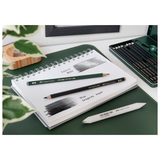 Specifikacija: šiljena; debljina mine: 3,3 mm; bez gumice; šesterokutna; izuzetno mat grafitna olovka vrhunske umjetničke kvalitete; ultra mat grafitni ispis za smanjenje refleksije na papiru; najveća gustoća tonske vrijednosti za učinak maksimalne dubine; za pisanje, crtanje i skiciranje; posebno pogodno za jednobojne grafitne radove; posebno je otporna na lomljenje; eko olovka (drvo iz certificiranog održivog šumarstva); tijelo lakirano eko lakom na bazi vode