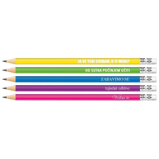 Specifikacija: tvrdoća: HB; šiljena; s gumicom i natpisom; set od 72 komada; u metalnoj čaši