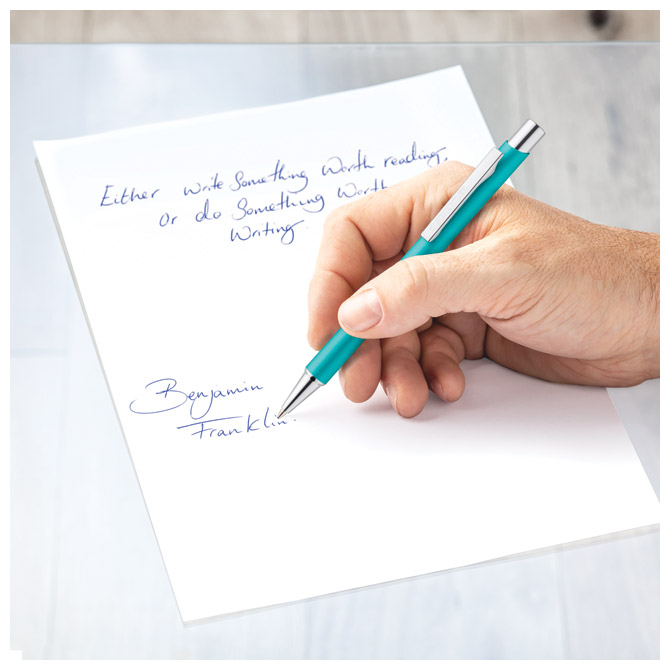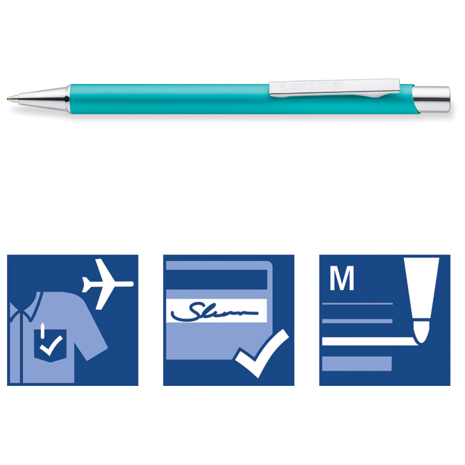 Specifikacija: širina ispisa: M; metalna; pritisni mehanizam; neizbrisiva tinta sukladno normi ISO 12757-2; siguran rad u zrakoplovu zahvaljujući sustavu za izjednačavanje tlakova koji sprječava istjecanje tinte (airplane safe); visokokvalitetni metalni uložak velikog kapaciteta (G2); boja tinte: plava