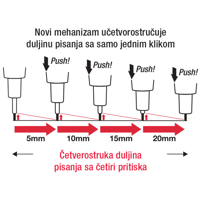 Specifikacija: ergonomski oblikovan grip; s gumicom; metalna klipsa; sa metalnim vrhom koji se posve uvlači u olovku (sistem protiv pucanja mine); pritiskom vrha olovke mina se nadoknađuje; novi mehanizam učetverostručuje duljinu pisanja sa samo jednim klikom; kapica sa okretnim sistemom za označavanje koja mina se koristi (3H, 2H, H, HB, B ili F); 2 funkcije: za pisanje i tehničko crtanje