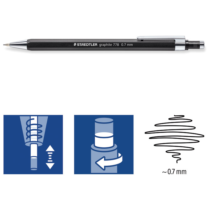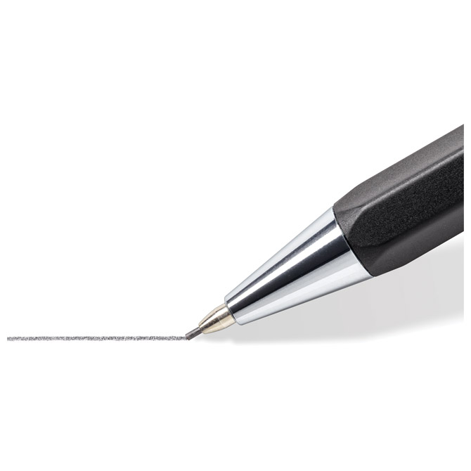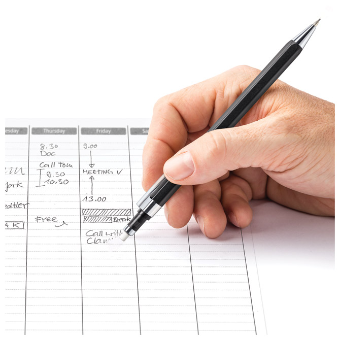 Specifikacija: s gumicom (bez lateksa i PVC-a); vrh i klipsa od metala; plastična; tanka, šesterokutna; s mat završetkom; vrh se uvlači; sistem protiv pucanja mina