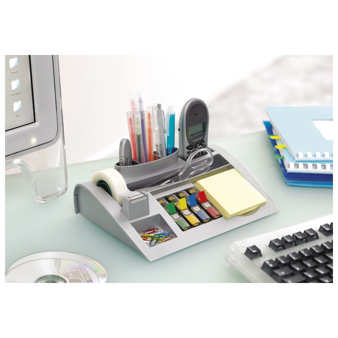 Specifikacija: sadrži: blok samoljepljivi Post-it® 654 žuti (dimenzija 76×76 mm; 72 g/m2; 100 listova; listovi se ne uvijaju; mogućnost višestrukog premještanja), zastavice samoljepljive Post-it® 683-4 (dimenzija: 11,9×43,1 mm; 4 boje x 35 zastavica; za označavanje stranica i dokumenata; boje: crvena, plava, zelena i žuta; blister) i ljepljivu traku Scotch® Magic™ 810 (dimenzija: 19 mm x 33 m; višenamjenska; nevidljiva; ne ostavlja vidljive tragove prilikom fotokopiranja; s vremenom ne žuti; može se po njoj pisati; odvaja se tiho i bez kidanja; kida se prstima; celulozni acetat; prozirno bijela); pretinci za: olovke, kalkulator, spajalice i čavliće; u kartonskoj kutiji