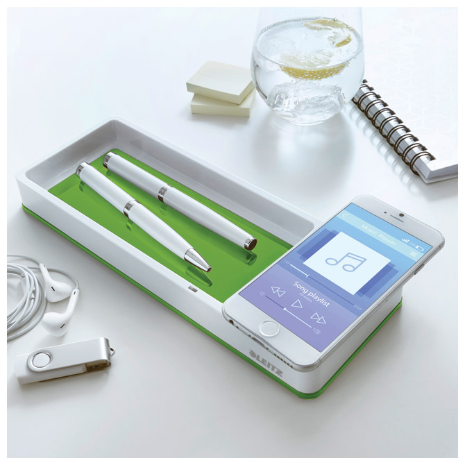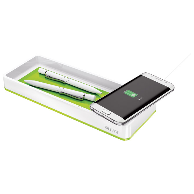 Specifikacija: mjesto za odlaganje pisaćeg pribora, mobitela, spajalica…; sa indukcijskim punjačem (isključivo za bežično punjenje); baza se spaja kabelom (kabel je uključen) u USB port (u laptop, USB HUB, računalo…); ušteda energije (prestaje puniti kad je baterija na 100 %); ulaz: 5V/1A, izlaz max: 1A; LED indikator koji označava da je ispravna pozicija za punjenje; dimenzija: 266x101x28 mm