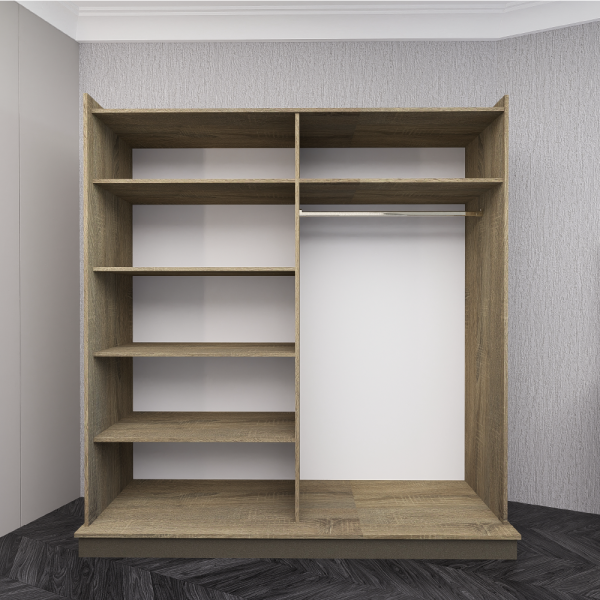 Unutrašnjost ormara je funkcionalna s pregradnim policama, prostorom i metalnom šipkom