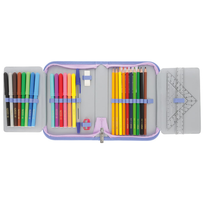 Specifikacija: 1 zip; 2 preklopa; punjena s 31 komadom pribora: flomaster školski 14 boja, boje drvene 8 boja, olovka grafitna HB x 2 komada, šiljilo, gumica, ravnalo pvc, trokut, olovka kemijska; dimenzija: 20,5x14x3,8 cm
