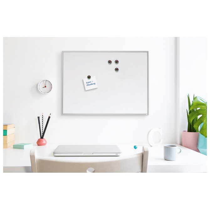 Specifikacija: dimenzije: 58,5×44 cm; za suho brisanje; s aluminijskim okvirom; može se montirati na zid s ljepljivim jastučićima; može stajati vodoravno ili okomito; sadrži: 2 markera za ploču, 4 magneta za ploču, ljepljive jastučiće za montažu, brisač za ploču