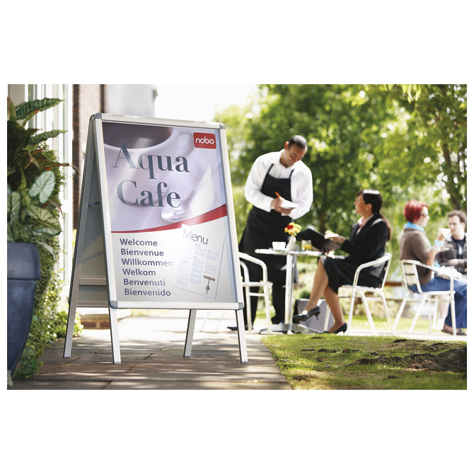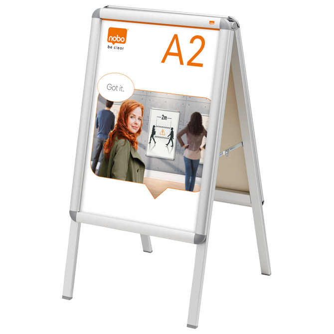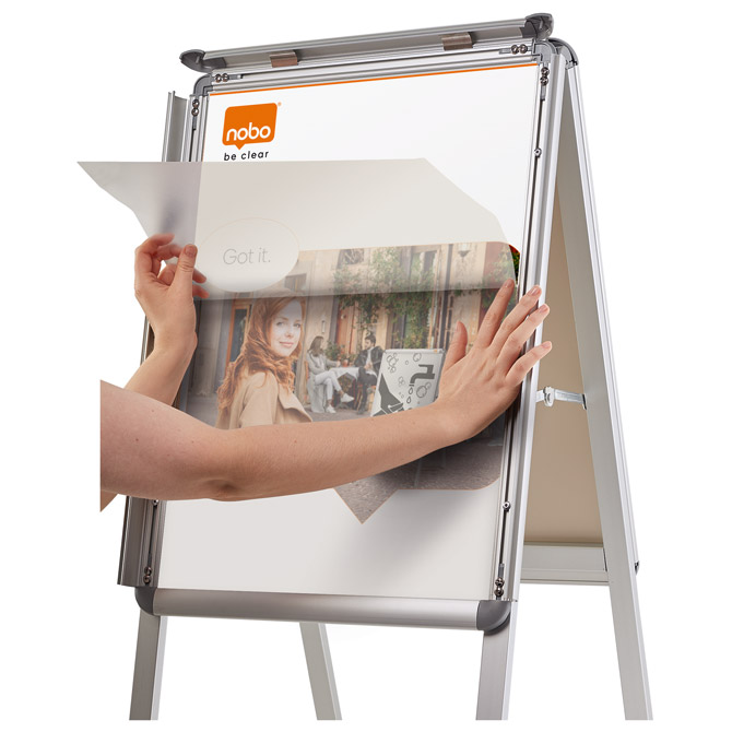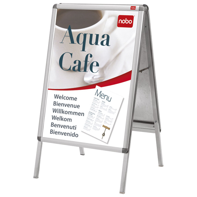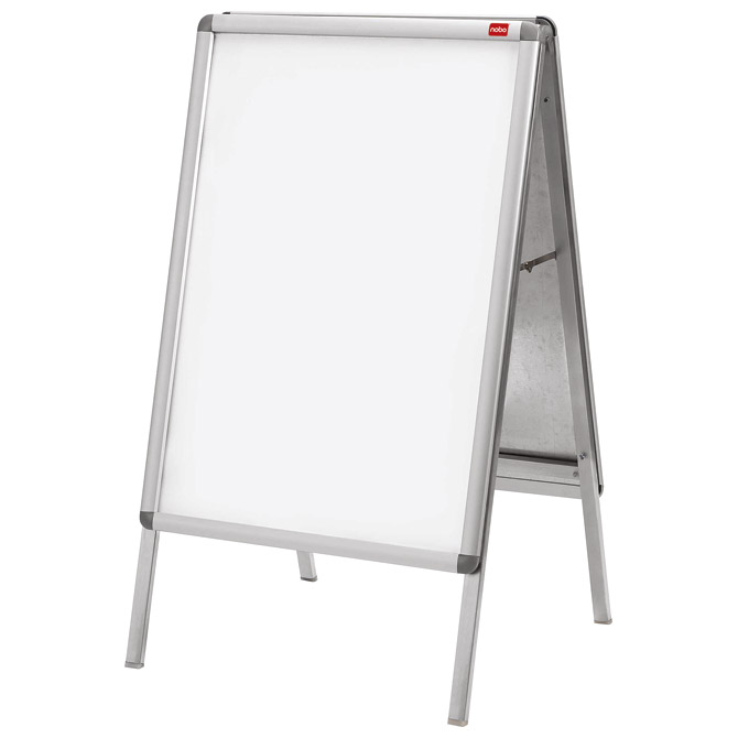 Specifikacija: samostojeća dvostrana ploča; metalne noge i leđa; može se koristiti unutar i van zatvorenih prostora; visoko kvalitetni 32 mm anodizirani aluminijski okvir; sklopiva; 2 pretinca; jednostavna promjena plakata (podignite četiri ruba, uklonite zaštitnu foliju i ubacite plakat); antirefleksni zaslon štiti plakate od prašine i prljavštine