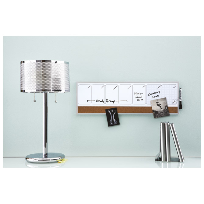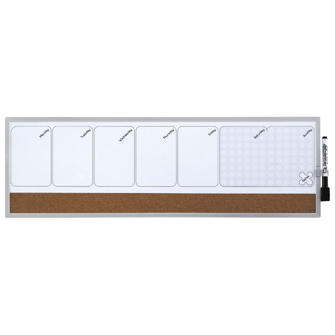 Specifikacija: tjedna; dimenzija: 58,5×19 cm; ploča bijela zidna magnetna i pluto ploča; srebrni aluminijski okvir; koriste se markeri za bijelu ploču i čavlići za pluto ploču; sadrži: 2 magneta, crni magnetni marker sa brisačem i pribor za montažu