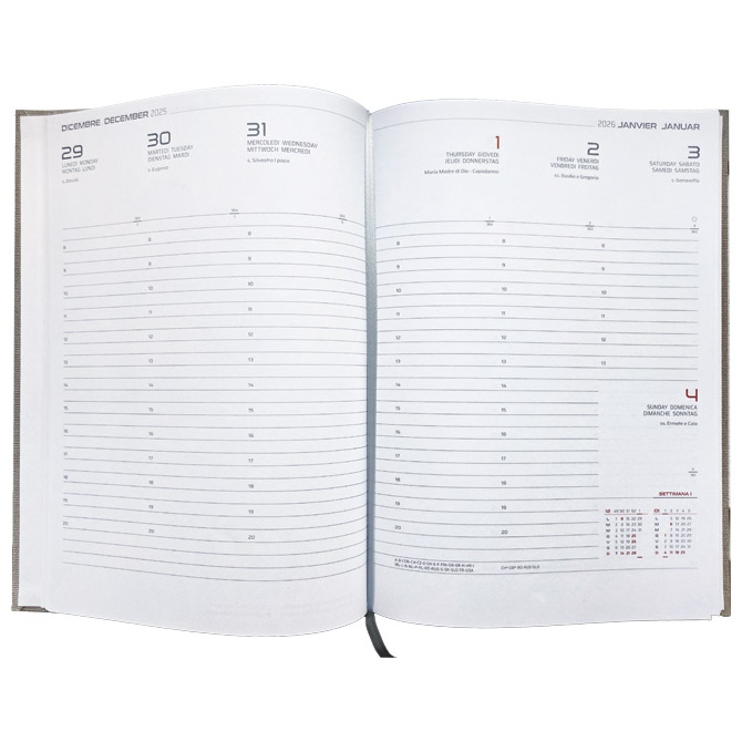 Specifikacija: format: B5; knjižni blok: 144 stranice (sa adresarom); 70 g/m2; bijeli papir; s perforacijom na rubovima; jedan tjedan na dvije stranice; korica je izrađena od materijala koji je pogodan za: suhi žig