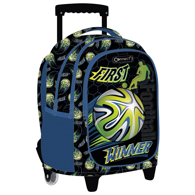 Specifikacija: dimenzija: 34x44x20 cm; teleskopska ručka i pojačana ručka za nošenje; ojačana stražnja strana s pojačanim i reflektirajućim remenima osigurava čvrsto prianjanje, pravilnu distribuciju težine i zaštitu kralježnice; anatomski oblikovane široke naramenice; remenčići za podešavanje; 3 prostrana pretinca knjige, bilježnice i pribor; 2 džepa sa bočne strane; bočna zaštita; zaštita za kotače; materijal: 100 % poliester; 1,6 kg; kapacitet: 30L