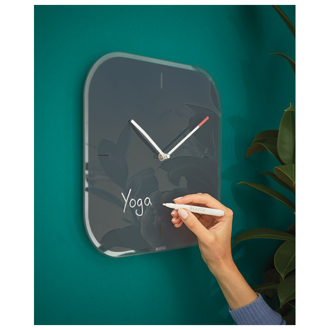 Specifikacija: dimenzija: 30x30x4 cm; tihi kvarcni satni mehanizam idealan je za urede, prostore za čitanje i spavaće sobe tako da vas ne ometa zvuk otkucavanja sata; napravljen od kaljenog sigurnosnog stakla od 4 mm s velikom otpornošću na ogrebotine i udubljenja; vrh kazaljke za minute je crvene boje; idealan za dom i ured; može se kombinirati s ostalim Leitzovim proizvodima iz Cozy asortimana za udobnost i stil uz vrhunsku kvalitetu, idealno za produktivno radno okruženje; dolazi sa jednim markerom za pisanje vlastitih brojeva ili bilješki po staklenom satu sa brisačem na čepu; 1 AA baterija (nija uključena); u kartonskoj kutiji
