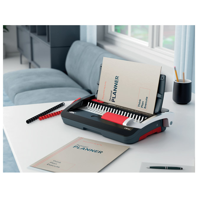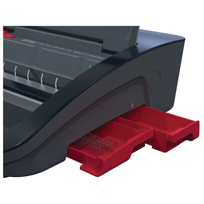 Specifikacija: format: A4/A5; buši do 12 listova 80 gramskog papira; ručna bušilica s jednom ručkom; kapacitet; 19/165 listova; može uvezivati do 165 listova odjednom koristeći plastične spirale promjera 19 mm; zahvaljujući svom laganom i prostorno učinkovitom dizajnu, može se koristiti bilo gdje i bilo kada te se lako posprema kada nije u upotrebi; uključuje ladicu za ostatke papira radi lakšeg odlaganja te praktičan pretinac za odlaganje pribora; dimenzije 458x295x264; garancija na stroj 2 godine