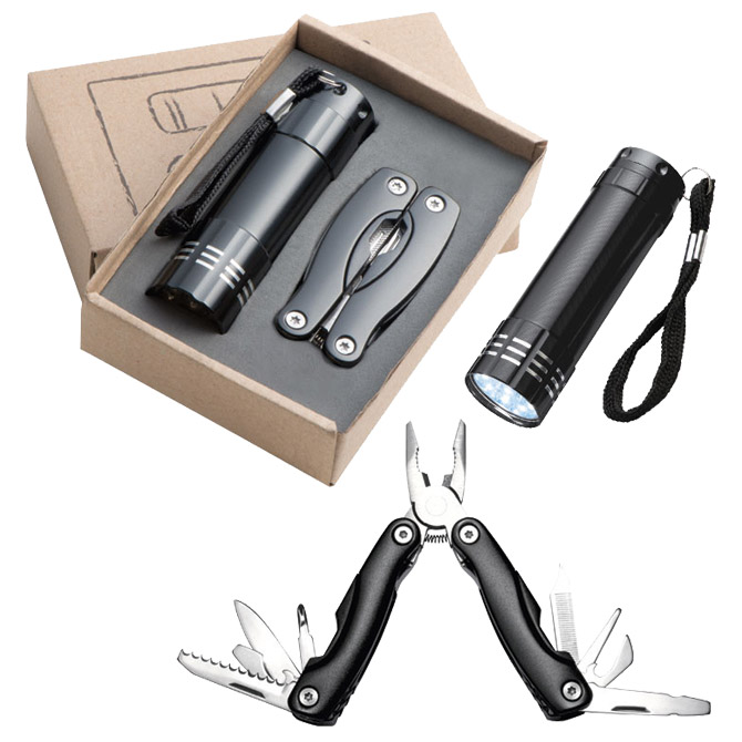 Specifikacija: sadrži: svjetiljku ručnu (9 LED; aluminijska; 3 AAA baterije (uključene)) i multifunkcijska kliješta (nož, pilu, otvarač za boce, turpija, odvijač…)