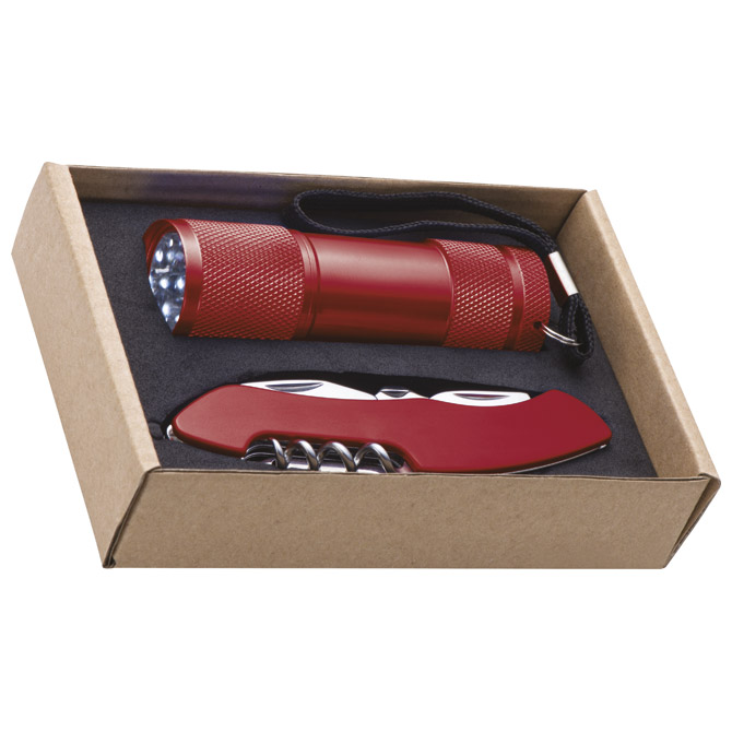 Specifikacija: sadrži: svjetiljku ručnu (9 LED, aluminijska) i nožić džepni (sadrži: nož, pilu, otvarač čepa za bocu sa odvijačem, vadičep, otvarač konzervi, škare,..); dimenzija: 13,5×8,8×3,1 cm; 3 AAA baterije (uključene); u kutiji
