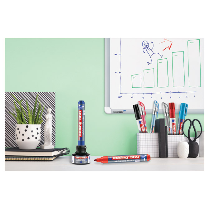 Specifikacija: 25 ml; u bočici s kapilarnim sustavom punjenja; sigurno i jednostavno punjenje; tinta je slabog mirisa, otporna na svjetlo i brzo se suši; bez dodanog butil acetata; punjenje je ekološki prihvatljivo jer produžuje životni vijek markera i time smanjuje potrošnju materijala; za ponovno punjenje markera za bijelu ploču Edding: Comfort 2, 250, 360, 361, 363, Ecoline 28 i Ecoline 29; jednostavno ostavite marker vrhom prema dolje u bočici za punjenje najmanje sat vremena ili idealno preko noći i marker je ponovno spreman za pisanje