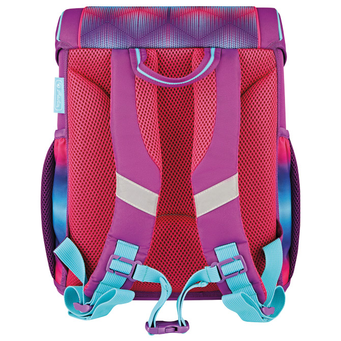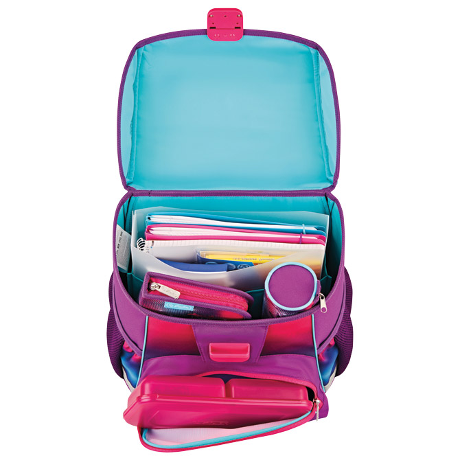 Specifikacija: sadrži: torbu školsku (dimenzija: 37x31x22 cm; kapacitet: 15 l; težina: 900 g; anatomska; ergonomski oblikovan leđni dio omogućava protok zraka; podesive naramenice; kopča na klik; 3M reflektirajuće trake; vodootporni materijal; veliki unutarnji pretinac sa posebnim pretincem za knjige; 1 prednji džep; 2 džepa sa strane); vrećicu za tjelesni, pernicu punjenu sa 16 komada pribora i pernicu vrećicu okruglu